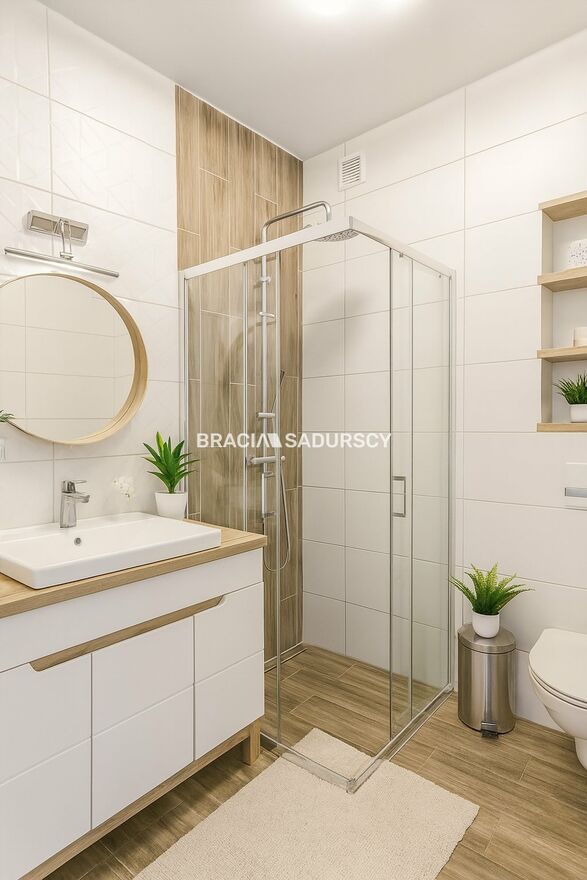 Wyposażenie łazienki: WC, umywalka, lustro, kabina prysznicowa